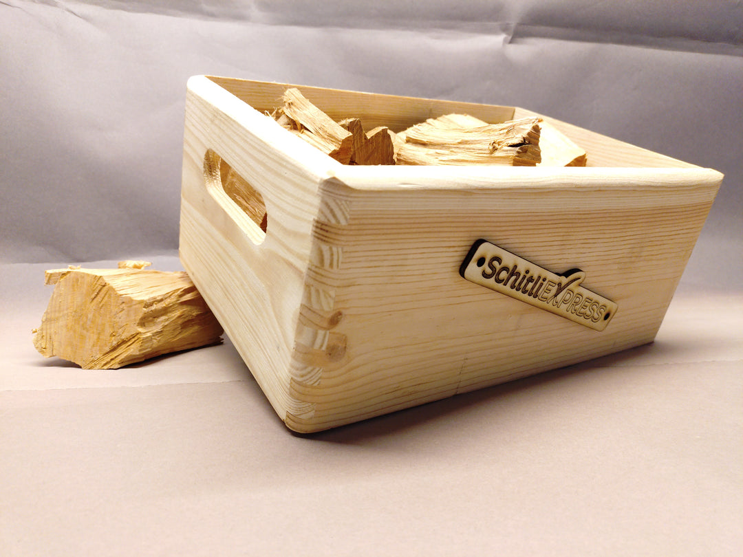 Unsere All-in-One SchitliBox enthält alles, was du fürs Feuer brauchst: Buchenbrennholz, Anzündholz, Anzündhilfen & Streichhölzer.